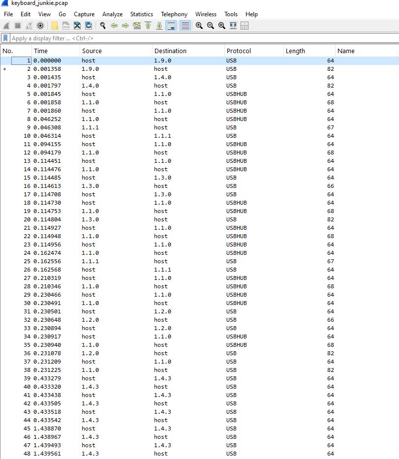 After that, I filtered out the 0ed columns (!(usb.capdata == 00:00:00:00:00:00:00:00))