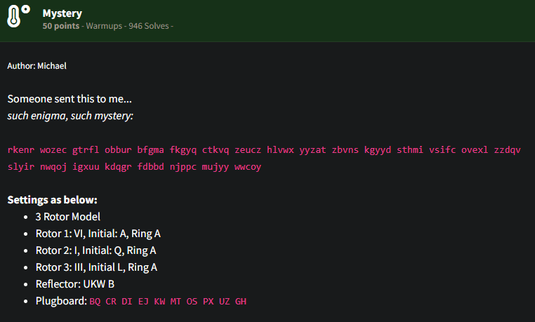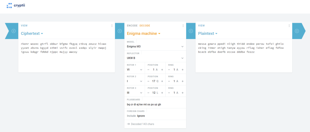 We now know we have an enigma machine and the settings, so we can just use an online tool to decode this. I used cryptii (https://cryptii.com/pipes/enigma-machine)