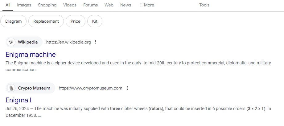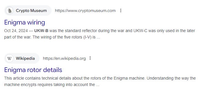 The next is the settings. They gave us enigma machine settings, but if we didn’t know this, we could do some research and figure it out. For example, looking up UKW B yields the following